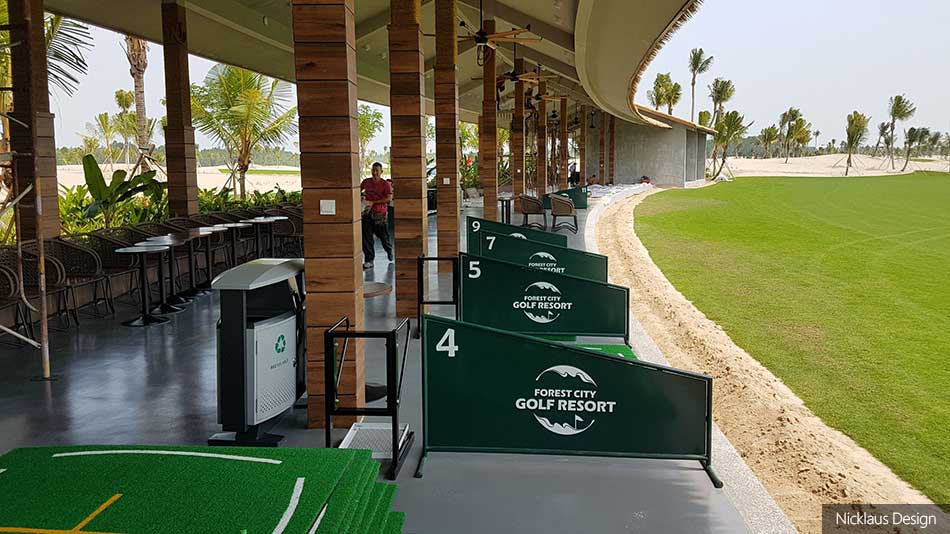 The massive 5-star Forest City Golf Hotel located in the middle of the property serves as the clubhouse. A grass turf driving range is available to golfers before and after their rounds. The 21-bay full-length driving range has an open thatched roof structure fronted by a large short-game and chipping- and putting practice area. Facilities and service and the on-site golf resort match the 5-star standard.