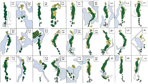 Almost all the holes have water hazards (small lakes or creeks) as well as several bunkers. For a good score, precise shots and good nerves are required. The challenging final hole is a 588 yard par 5 that demands a long and accurate tee shot to find ideal fairway position. This achieved, a stream and a lake must be crossed before the putter can be taken gratefully in hand. To complete the round, the narrow final green that slopes steeply from back to front must be negotiated.